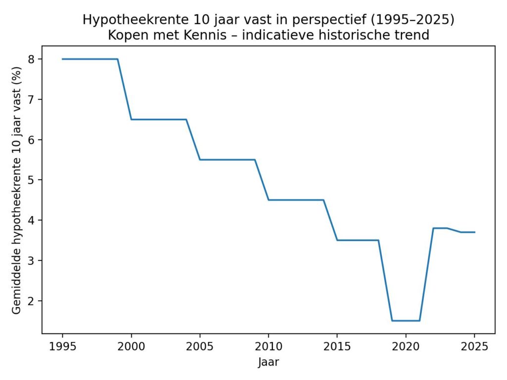 Veel kopers vergelijken de huidige rente onbewust met 2020 of 2021, toen 10 jaar vast rond 1 procent mogelijk was. Dat was echter geen normale marktsituatie, maar het resultaat van extreem ruim monetair beleid en uitzonderlijke economische omstandigheden.